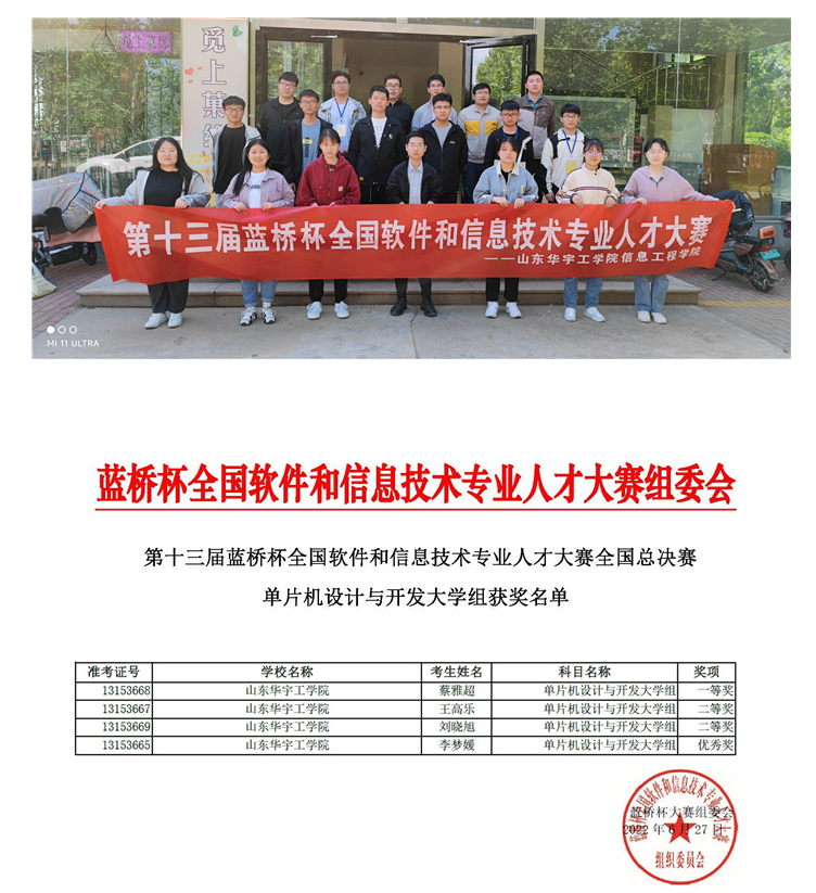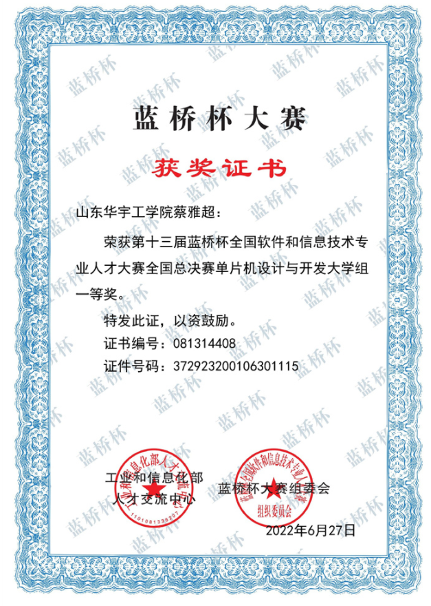 本届大赛由工业和信息化部人才交流中心主办,公司代表队与来自北京大学、清华大学、复旦大学、上海交通大学、中国科技大学等1064所高校的11061名顶尖选手集结赛场,争夺蓝桥杯全国总决赛桂冠。经过激烈角逐,公司员工蔡雅超荣获单片机设计与开发大学组一等奖、王高乐荣获单片机设计与开发大学组二等奖。